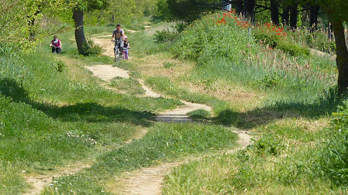 In Richtung Sète sind die Wege am Kanal nicht asphaltiert, aber bei trockenem Wetter kann man hier recht gut strampeln. Rechts sehe ich schon die roten Mohnblumen....