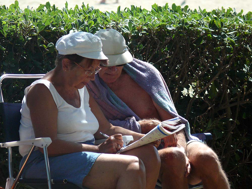 Im Schatten der Kieferwäldchen relaxen die Leute, lösen wie dieses niedliche Pärchen gemeinsam ein Kreuzworträtsel, lesen, schlafen, essen, schwameln...
