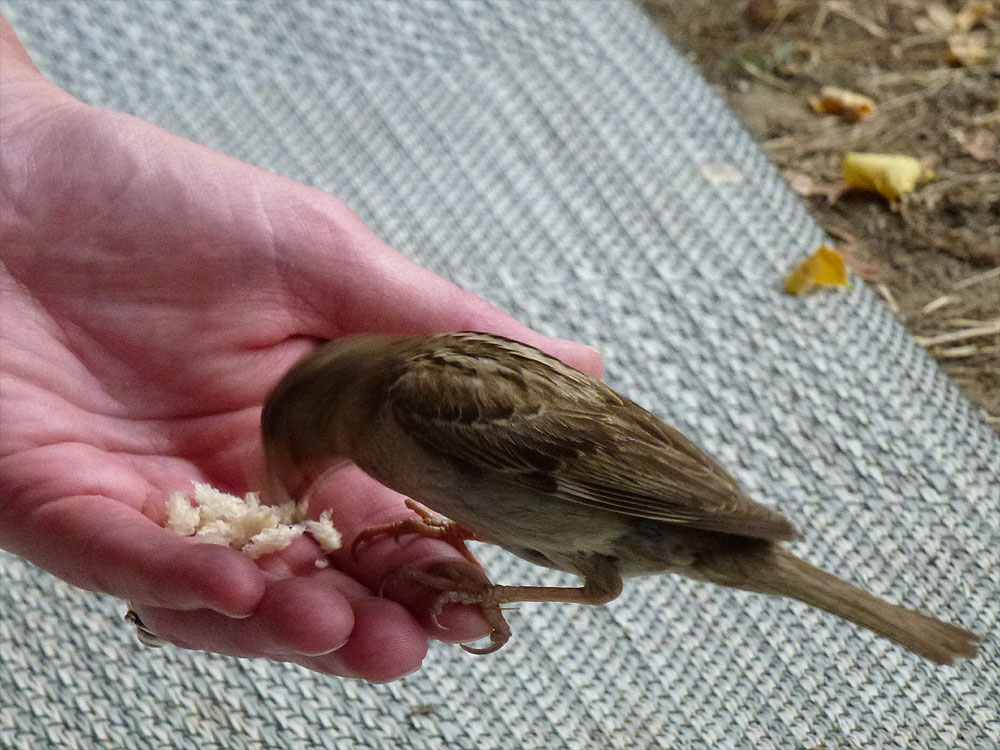 Zu jeder Mahlzeit erscheinen auch immer laut schimpfend unsere "Haustiere", die Spatzen, zur Fütterung mit Baguettekrümeln. Besonders zutraulich ist "Elli", die sich frech auf den Finger oder die Tischkante setzt und sich sogar kraulen lässt!