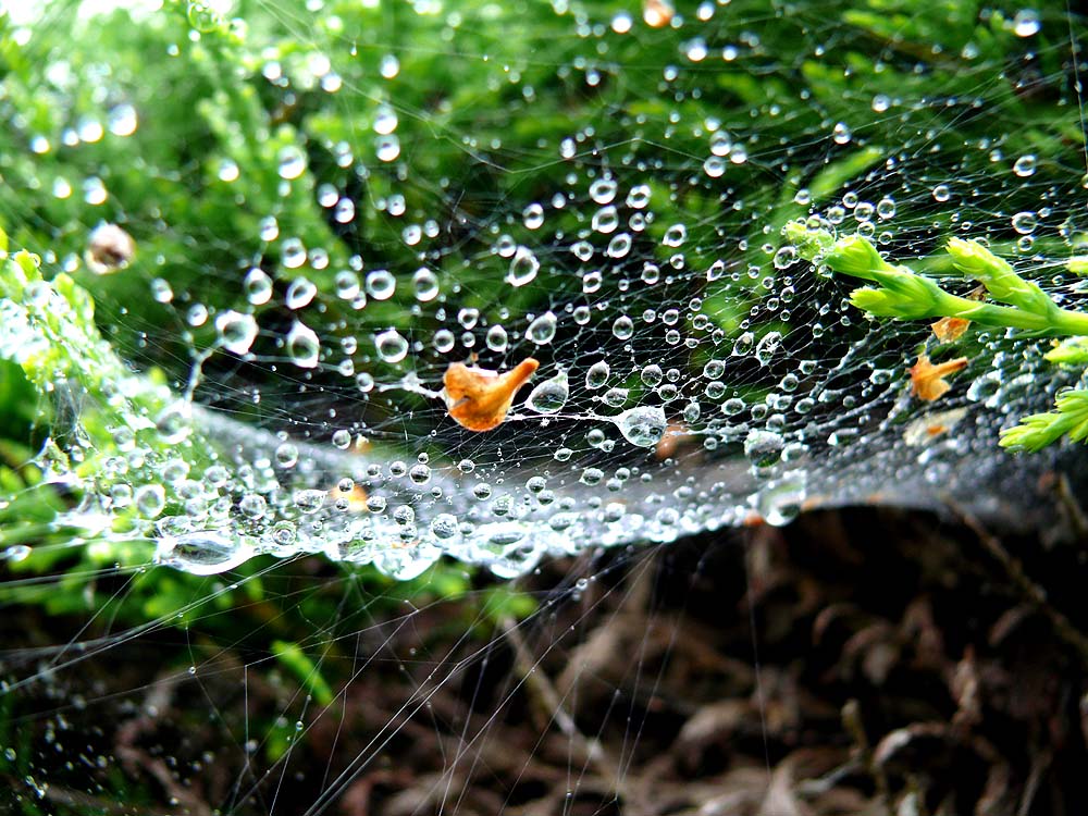 Am nächsten Morgen bilden die Wassertröpfchen zauberhafte Gebilde in den Hecken.