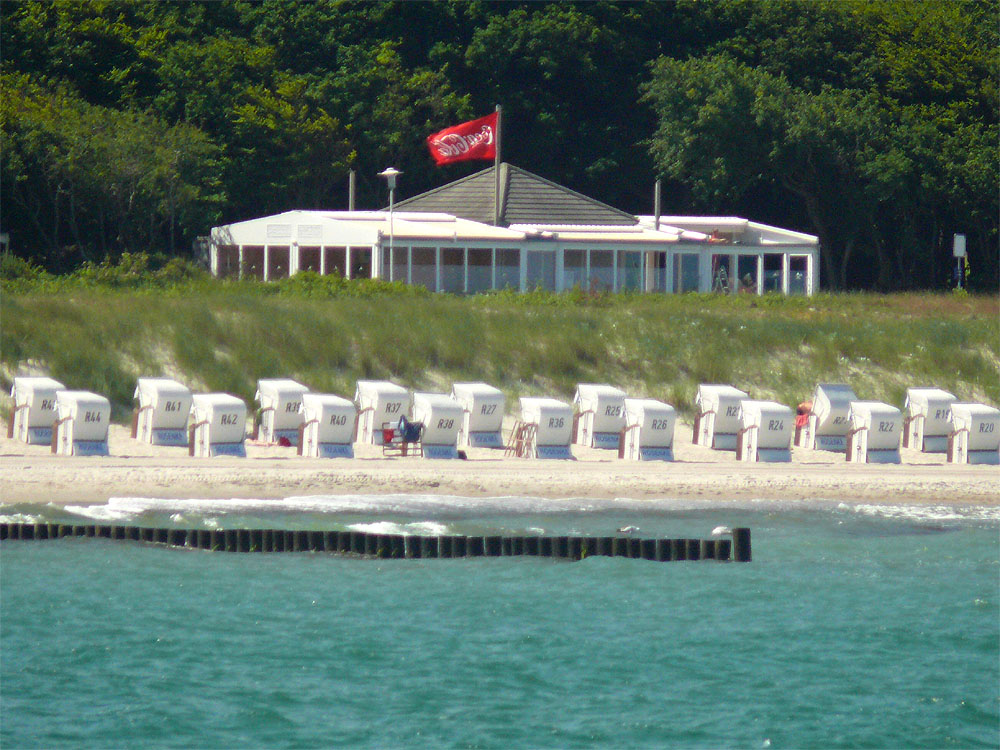 Die akurat sortierten Strandkörbe schauen vom Strand und über Dünen, Pavillon und Mischwald direkt in die gleißende Morgensonne. So viele Leute sitzen heute Morgen noch nicht drin...