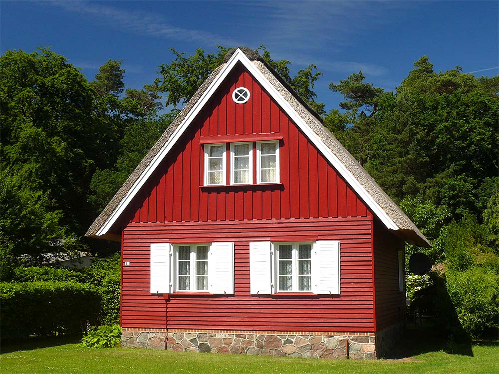 Ein wunderschön hergerichtetes rotes Holzhaus mit Reetdach...