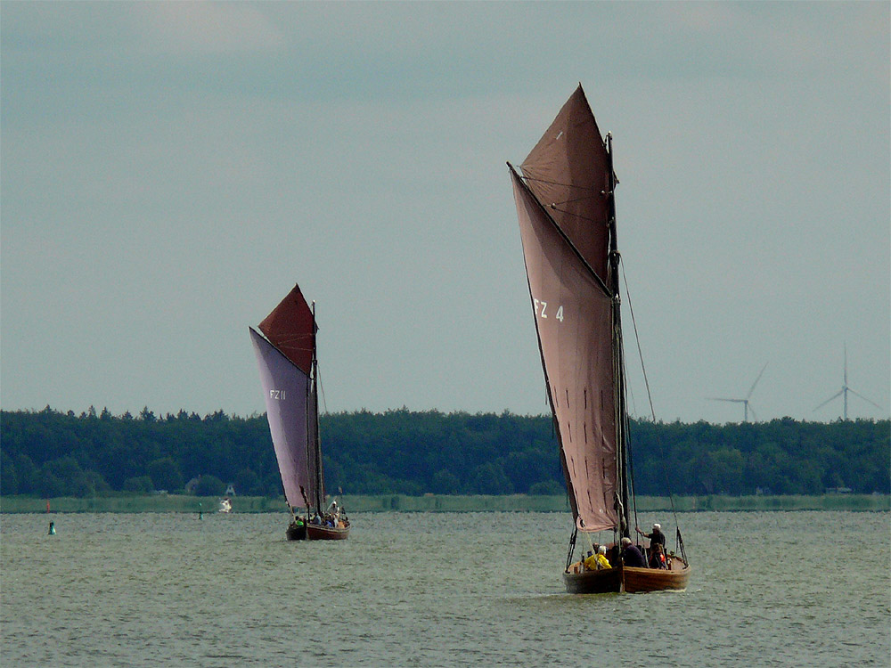 Ein majestätisches Bild zeigt die beiden alten Zeesboote mit ihren erdbraunen Segeln in Gaffel- und Topgaffeltakelung. Sie wurden früher zum Fischfang in Bodden und Haff eingesetzt...