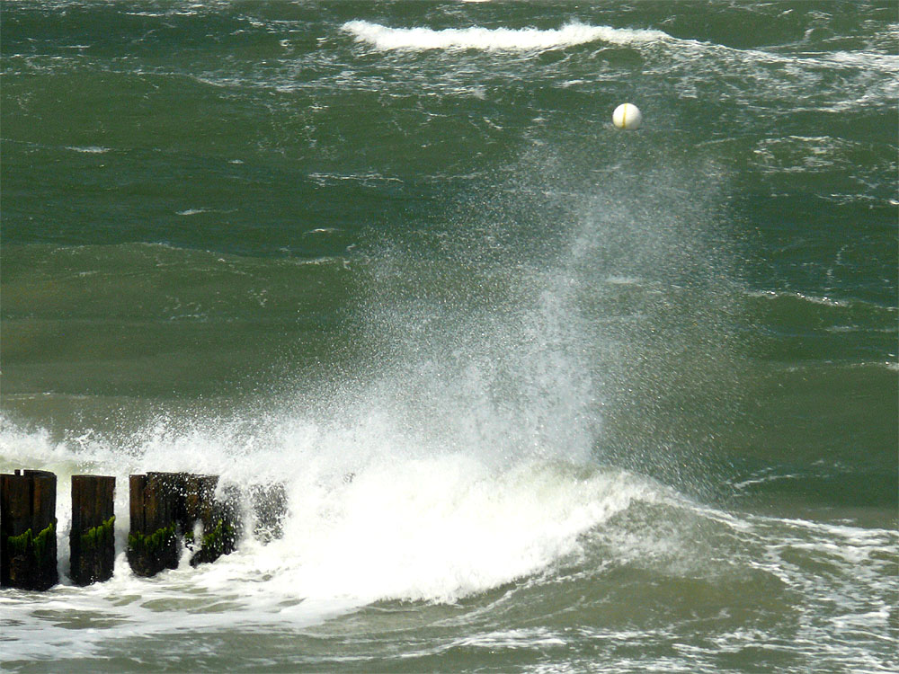 Immer wieder steigt die Gischt hoch, wenn die Brecher auf die Buhnen schlagen...