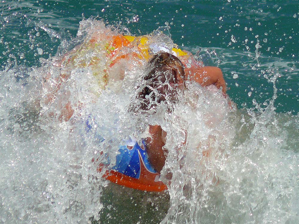 ...und wer dann ganz mutig ist, der schwimmt gekonnt durch die spritzende Gischt! Aber Vorsicht: bei ablandigem Wind sieht man die Reifen, Matratzen und Schlauchboote nur so durch die Luft wirbeln in Richtung Afrika. Und Tschüss!
