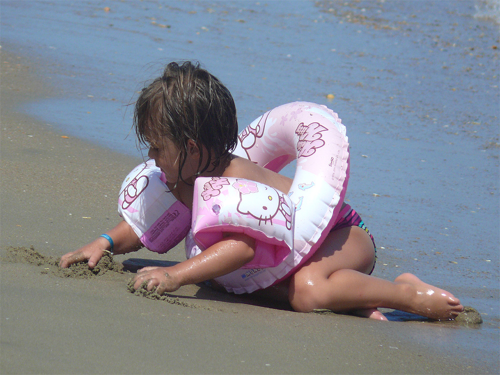 Die kleinen Kinder vergessen am Strand mit "Hello Kitty" die Welt um sich herum...