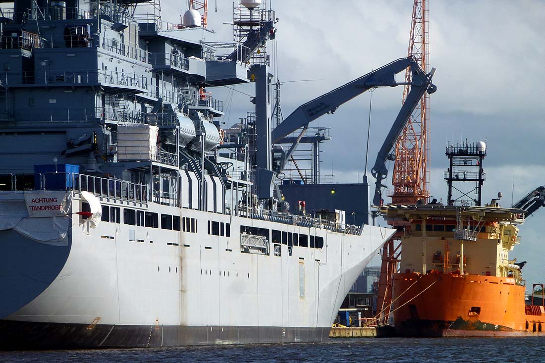 Unter anderem wird hier ein riesiges Versorgungsschiff für die Bundesmarine gebaut.