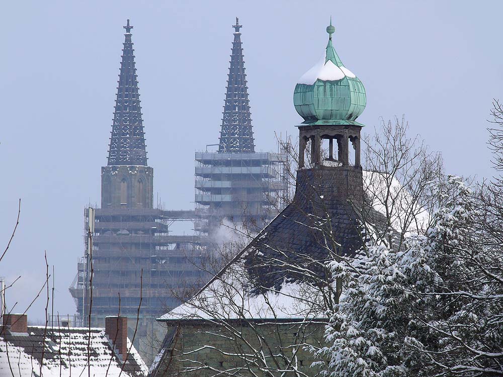 Hinter der Brunsteinkapelle erheben sich majestätisch die beiden -eingerüsteten- Türme der Wiesenkirche.