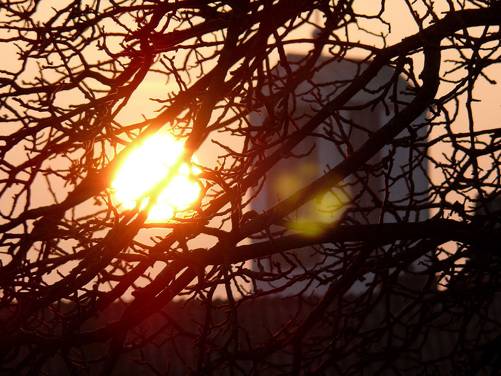 Sonnenaufgang, aus meinem Dachfenster gesehen mit dem Blick auf die Albertus-Magnus-Kirche.