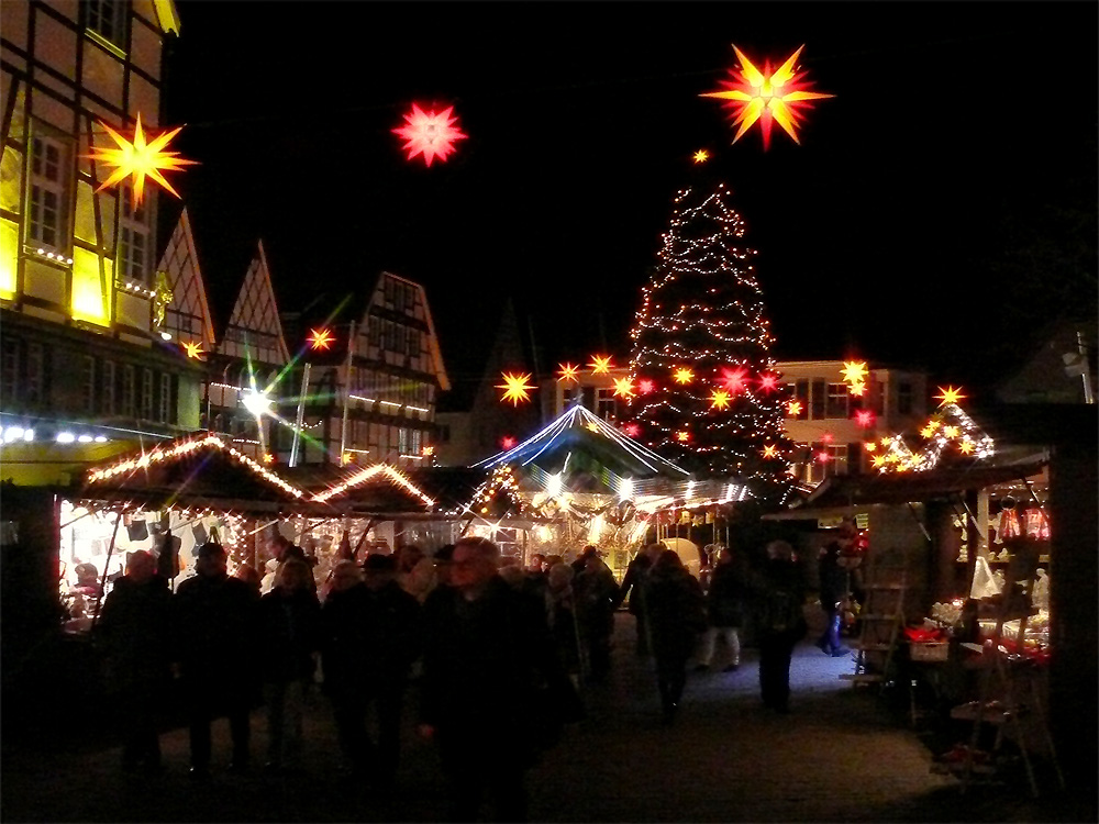Auf dem Soester Marktplatz steht ein riesiger Weihnachtsbaum und ringsum ist alles weihnachtlich beleuchtet und geschmückt...