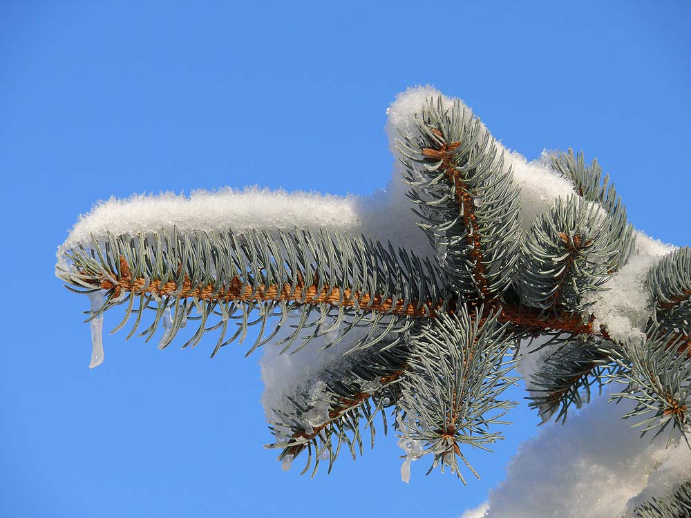 Die Sonne schafft es, an den oberen Zweigen kleine Eiszäpfchen zu bilden.