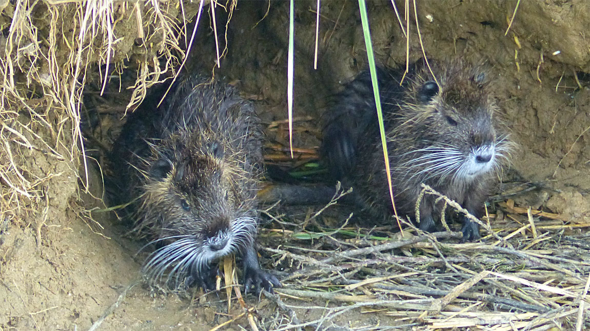 Es kommt noch doller: gegenüber an ihrer Erdhöhle meditieren seine beiden niedlichen Nachkommen und putzen sich die grauweißen Bärtchen!