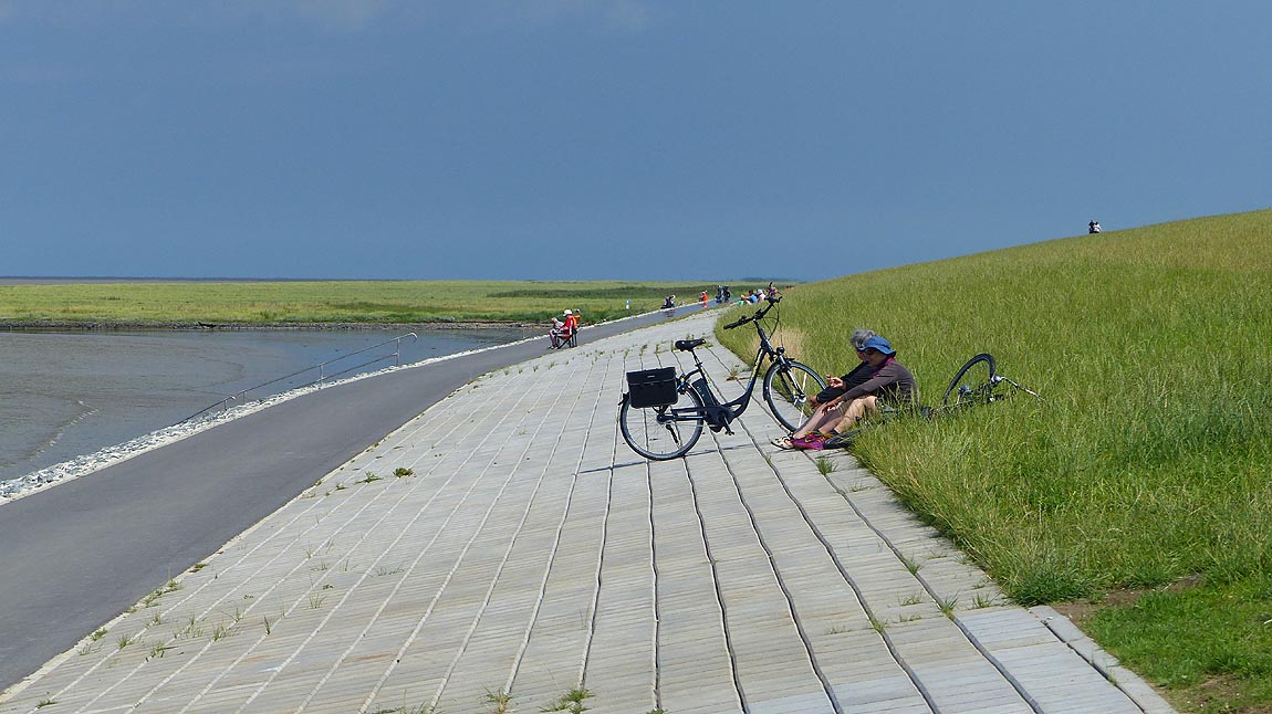 Unten am Deich macht man gern mal eine Pause vom Radeln und lässt gemächlich die Seele baumeln!