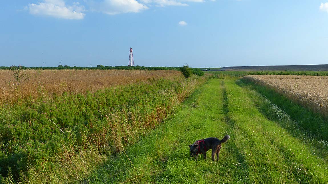 Im satten Abendlicht ist wieder Gassi-Zeit und wir haben einen Feldweg gefunden, wo Blesko ohne Ende schnuppern und geschäftlich tätig sein kann.