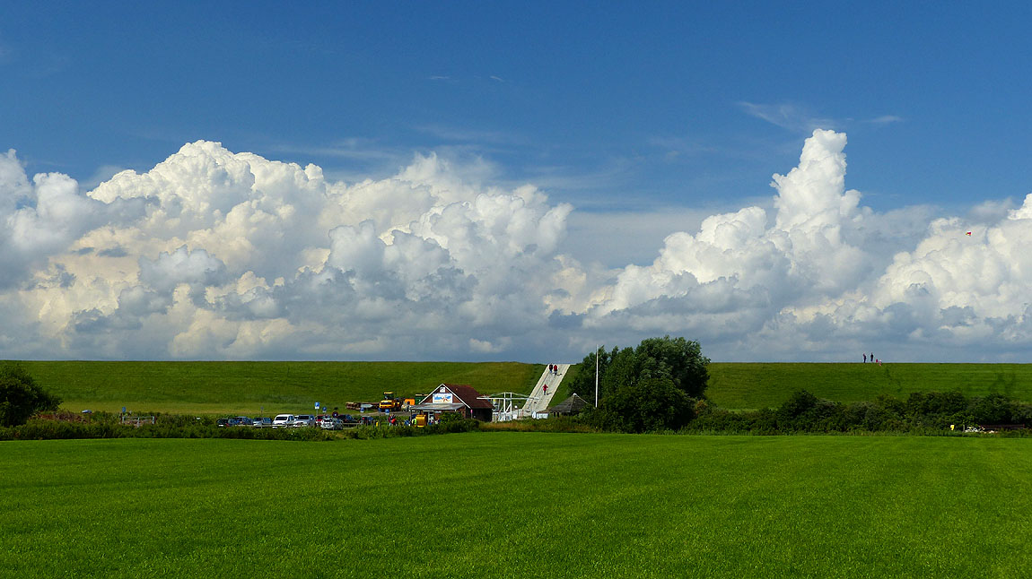 Gewaltige Wolken bauen sich am Spätnachmittag hinter dem Deich auf dem Meer auf...! An dem Kiosk ist übrigens eine Kite-Surfer-Schule und hier finden auch alljährlich im August die Wettrennen im Schlickrutschen statt!.