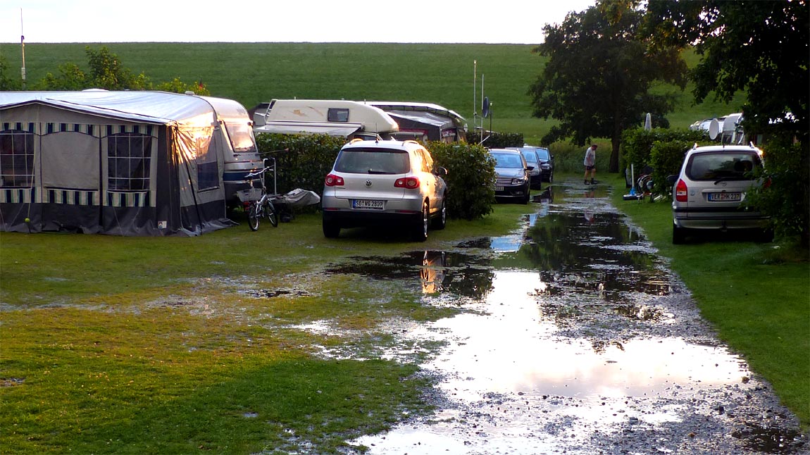 Am Abend schickt uns der Wettergott noch ein strammes Gewitter mit Wolkenbruch und Hagelschauern, Land unter im Vorzelt. Was soll's, das trocknet irgendwann auch wieder...