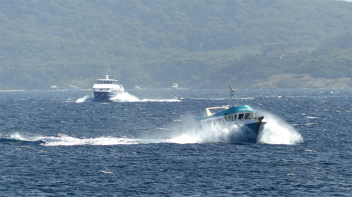 Der kräftige Mistral sorgt für einen munteren Seegang, der die feine Gischt an den fahrenden Booten immer wieder meterhoch spritzen lässt.