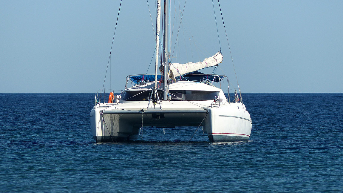 Draußen im Meer dümpelt ein toller Karamaran an seiner Ankerkette im sachten Wellengang...