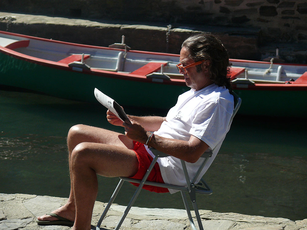 Der Monsieur tut sich mitten im Hafen die Ruhe an und liest in der Sonne seinen "Le Figaro"!