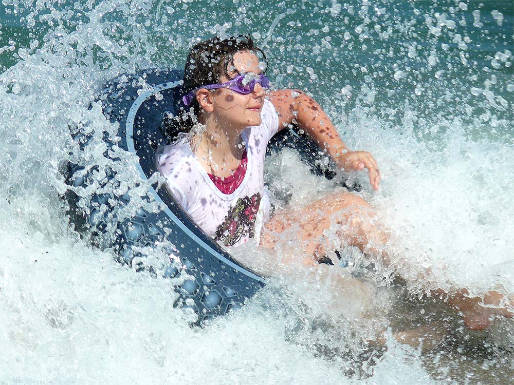 Mit dem Reifen in die Brandung! Absolut klasse, da spritzen die Wassertropfen wie wild...