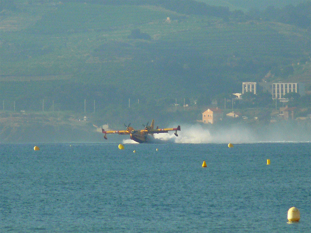 Im Dunst sieht man die Canadair-Löschflugzeuge in der Bucht vor Argeles, wie sie im Flug das Meerwasser einsaugen und dann schwerfällig mit lautem Gebrumme abheben.