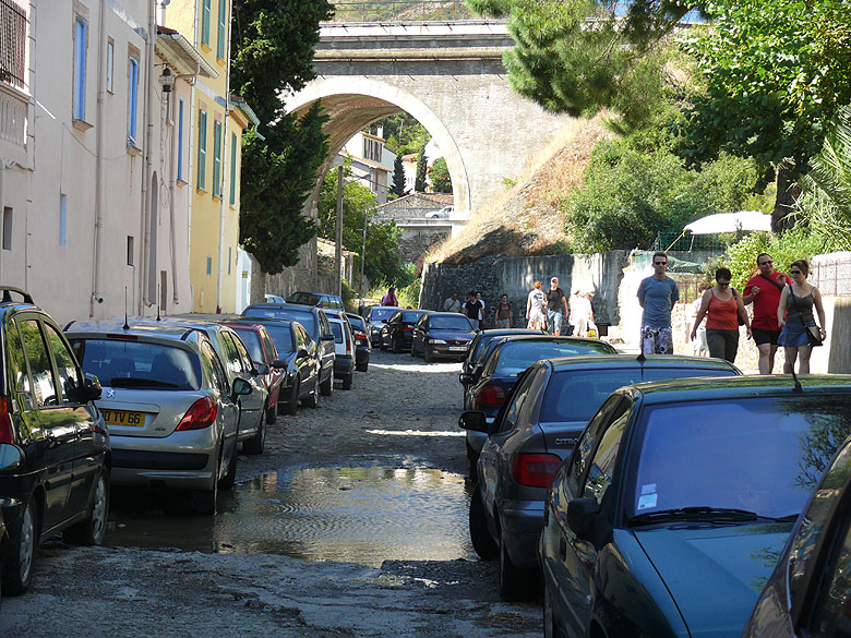 Zur Zeit der Schneeschmelze in den Pyrenäen ist diese Straße ein reißender Fluss, jetzt aber parken in dem engen, kieseligen Flussbett die Autos!