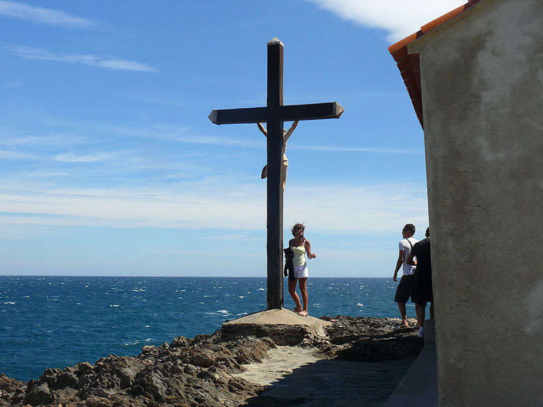 Auf dem Felsen vor dem Hafen steht eine kleine Kapelle mit einem großen Kreuz; es wird gern fotografiert, aber bei diesem Wind doch schon ein Risiko.