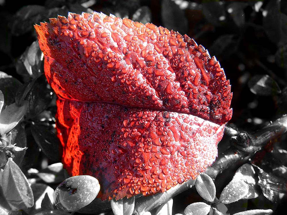 Herbstblatt mit Tautropfen auf Schwarz-Weiß