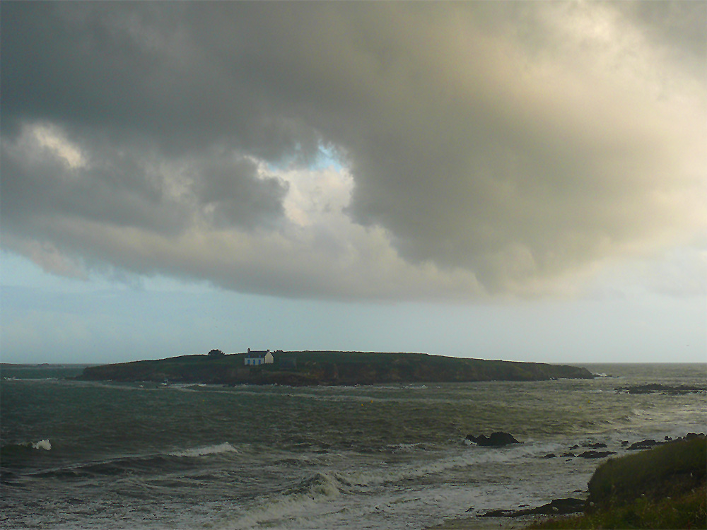 Bedrohlich ziehen sich dicke Wolken über der kleinen vorgelagerten Insel zusammen, die man bei Niedrig-wasser für eine Stunde kletternd besuchen kann! Wird die Zeit dort knapp, muss man sich sputen...