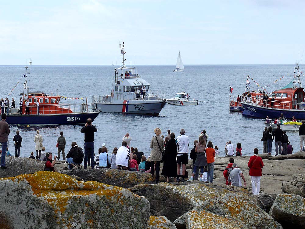 Nun fahren die Schiffe mit dem Bug sternförmig vor das felsige Ufer, von wo aus der Geistliche ("Le Pasteur") über Lautsprecher feierlich seinen Segen erteilt!