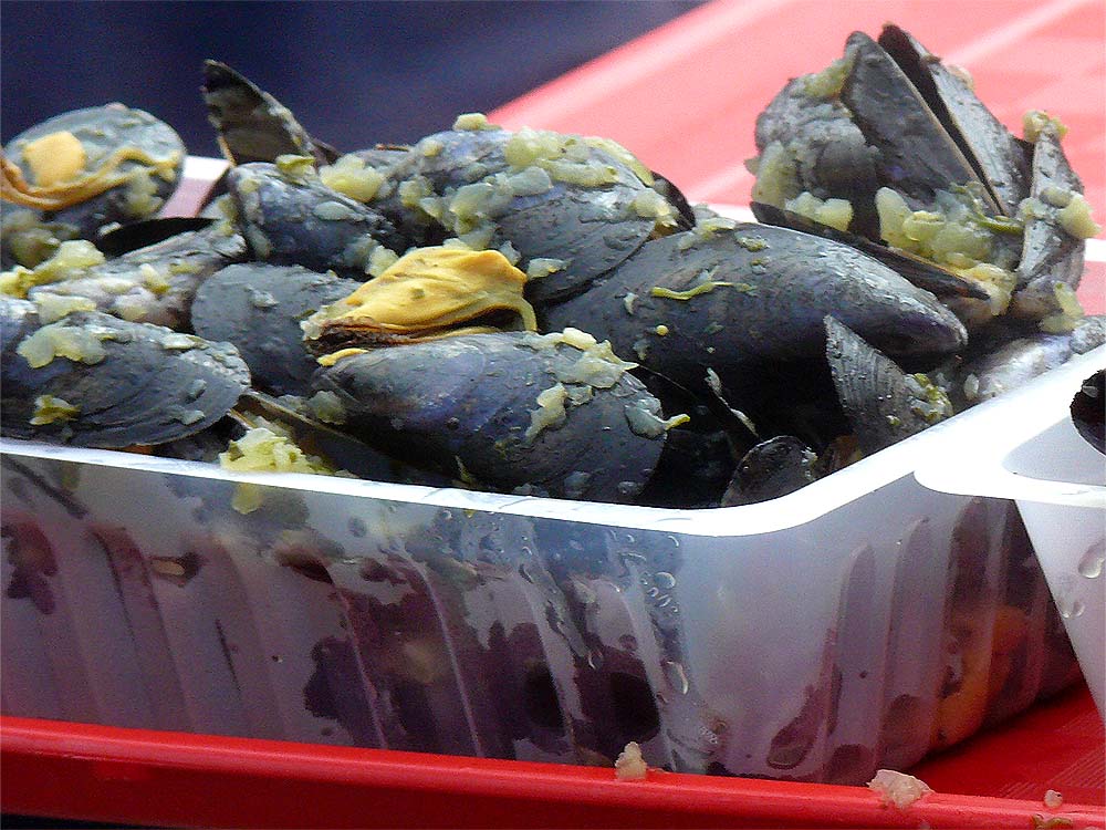 Es gibt Muscheln, gekocht in einem Sud aus Brühe, Zwiebeln, Knoblauch, Petersilie und frischen Kräutern!
