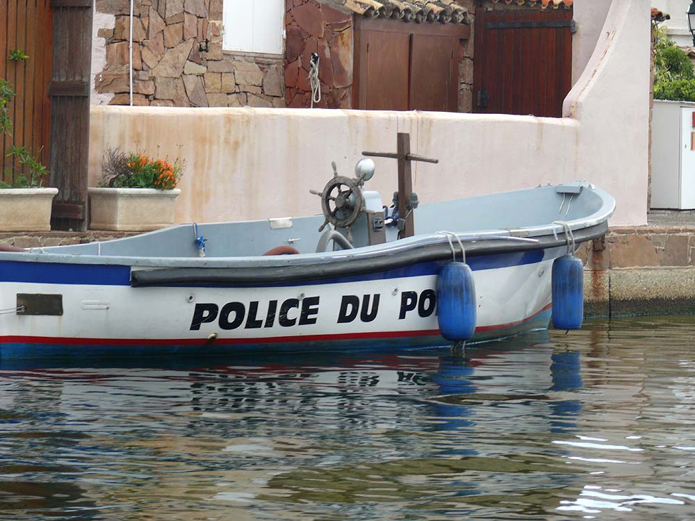 Tags darauf fahren wir nach Port Grimaud, einer künstlich gebauten, Venedig ähnlichen Hafenstadt. Im Vergleich zu den millionenschweren Yachten fährt die "Police du Port" einen kleinen Äppelkahn...