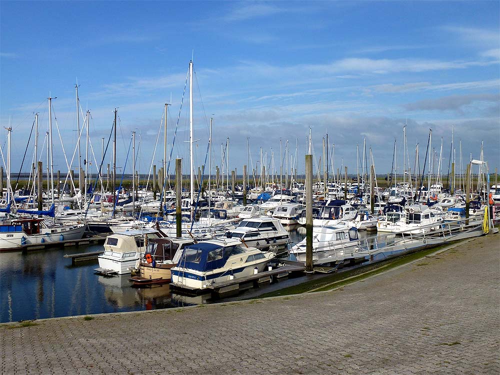 Im sauberen Yachthafen dümpeln viele Freizeitboote in ihren Boxen vor sich hin.