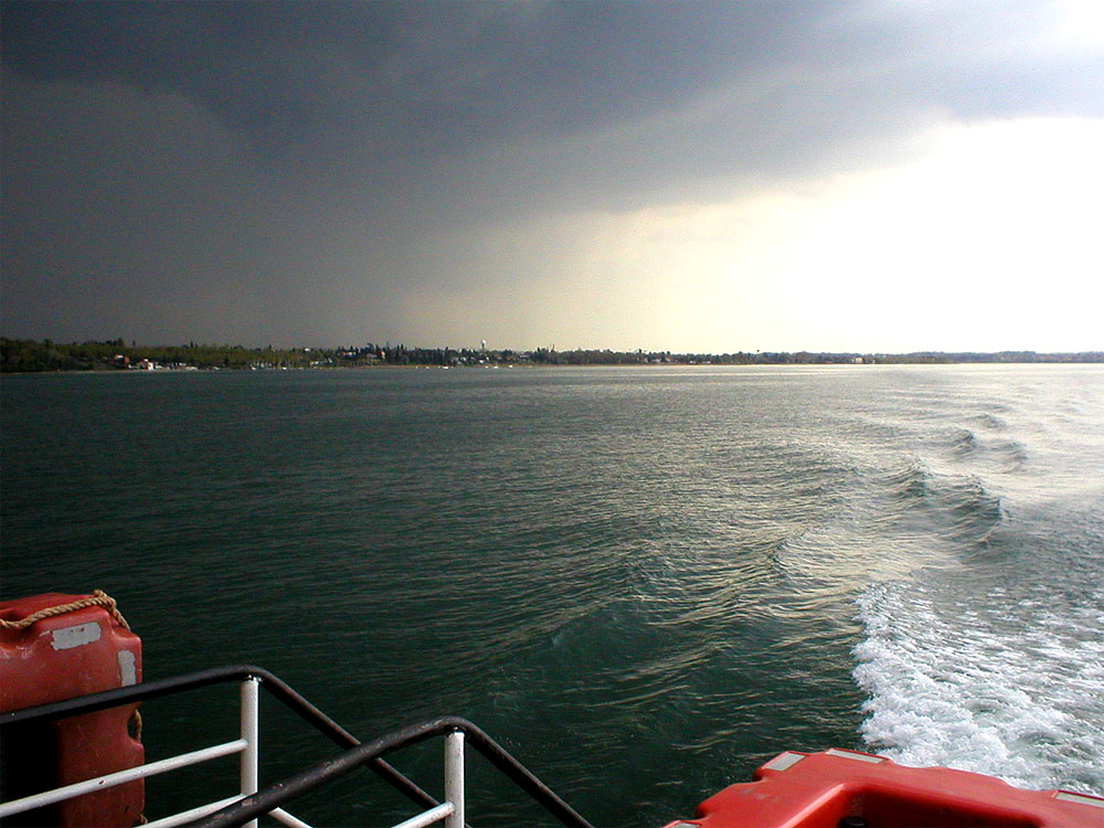 Wie aus heiterem Himmel (im wahrsten Sinne des Wortes) zieht auf einmal ein heftiges Unwetter heran. Gut, dass wir auf dem Schiff geschützt sind!