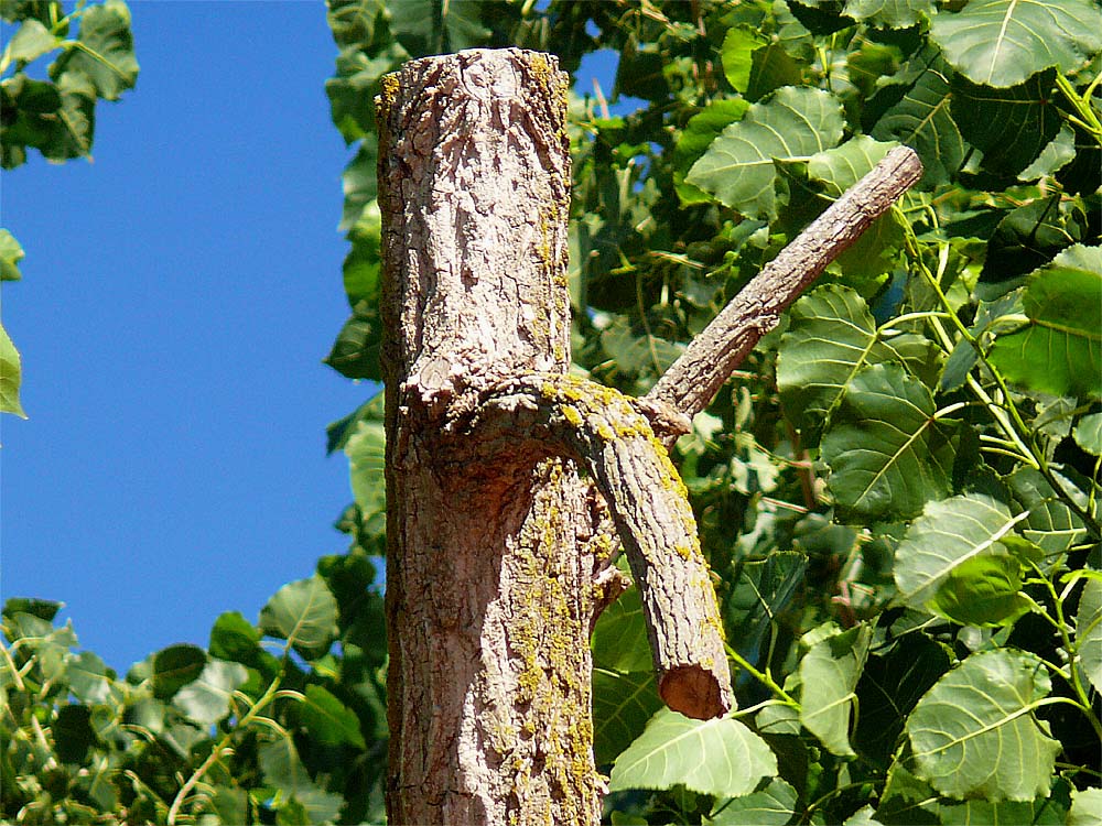 Dieser abgesägte Baumstumpf beim Nachbarn lässt unterschiedliche Sichtweisen zu. Für mich ist das ein Bier-Zapfhahn mit Hebel...
