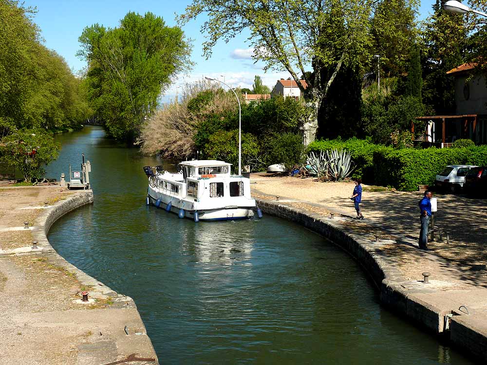 An der Schleuse in Portiragnes ist gerade ein Schiff gehoben worden und fährt in Richtung Beziers. Hier wird man zur Ruhe gezwungen, es geht halt nicht anders!