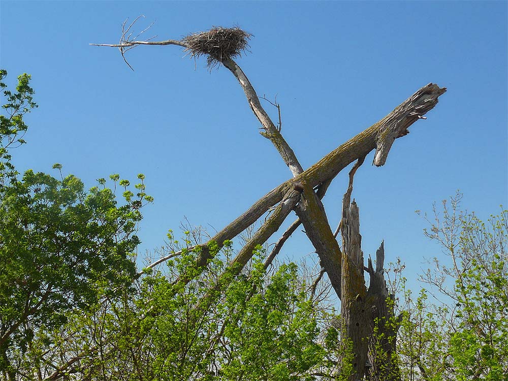 Was ist das denn für eine irre Konstruktion? Die Leute stehen auf dem Weg herum, zeigen auf das Nest und rufen aufgeregt: "Cigogne, cigogne!"