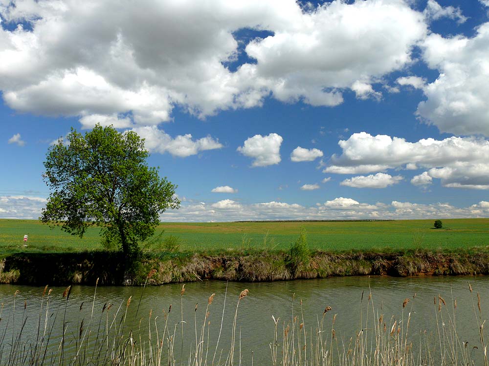 Kanal, plattes grünes Land, Bäumchen und endlos viele Wolken vor dem blauen Himmel...