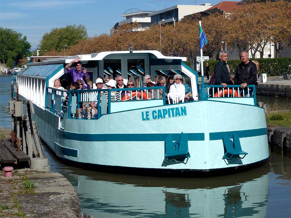 "Le Capitan" tuckert langsam in Schleuse 2. Die Menschen sind fröhlich und grüßen freundlich...
