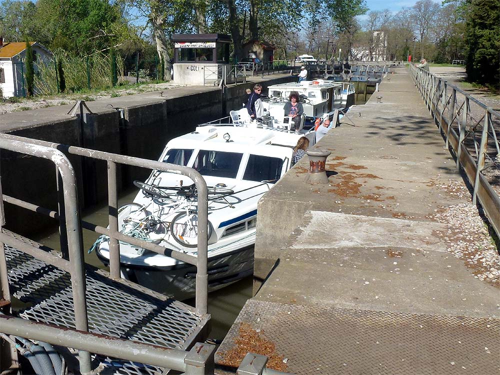 Derweil werden an Schleuse 1 zwei Boote gesenkt. Das ist ganz schön aufregend! Denn wenn man ein Schiff oben verknotet und der Wasserspiegel senkt sich, dann...