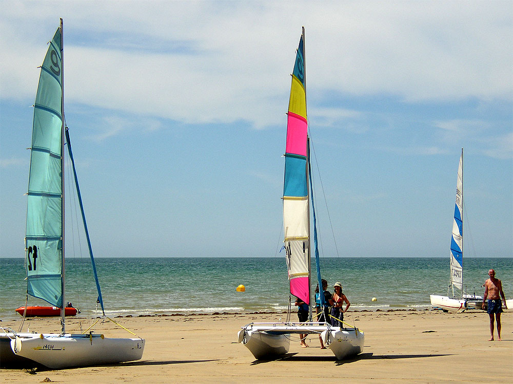 Bei Tag, wenn es nicht genug Wind gibt und dazu noch Ebbe ist, liegen diese Boote mit den farbenfrohen Segeln auf dem Strand.