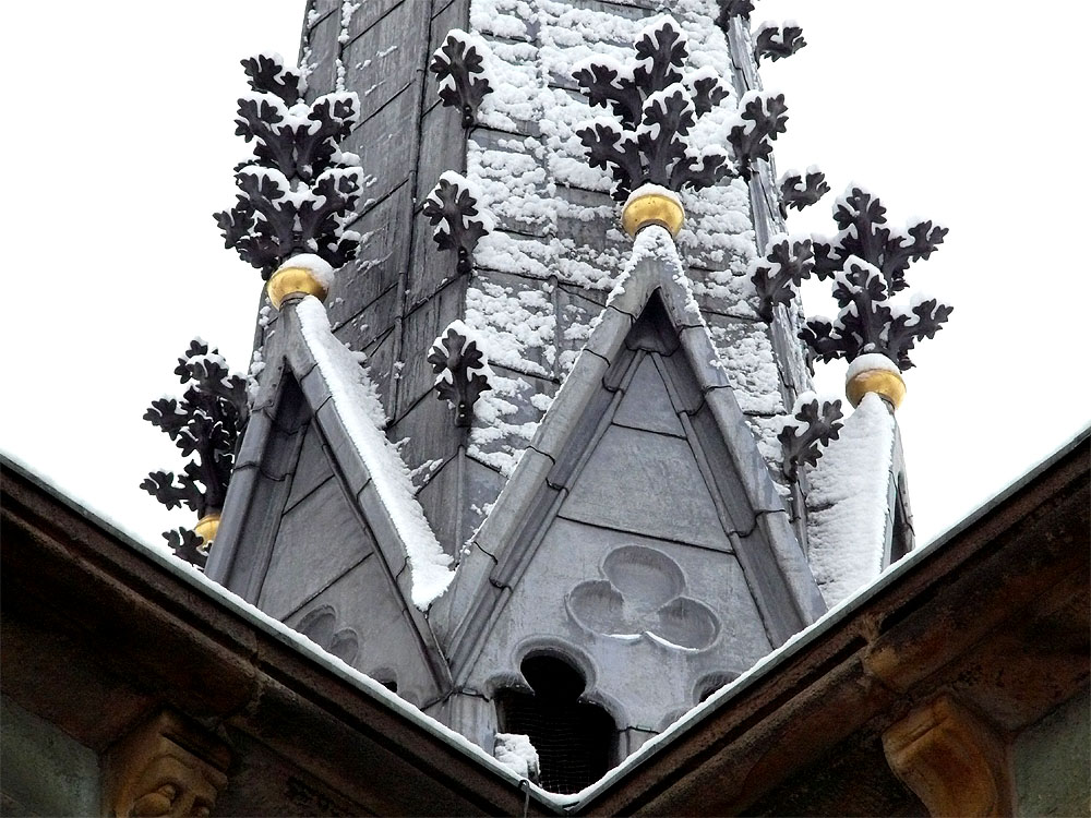 Oft nimmt man erst in besonderen Situationen, wie hier nach frischem Schneefall, der starke Lichtkontraste erzeugt hat, die hohe Kunst an diesem Turm des Patrokli-Doms wahr.