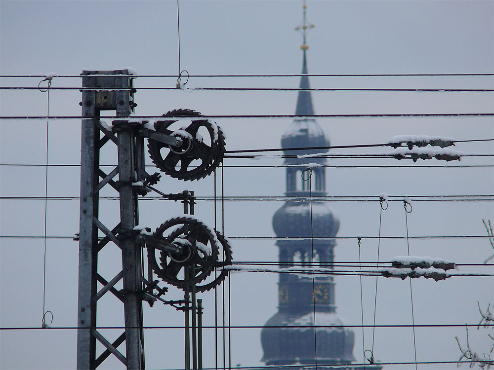 Ein Blick vom Soester Norden durch die Oberleitung der Eisenbahn auf den Turm der Petri-Kirche...