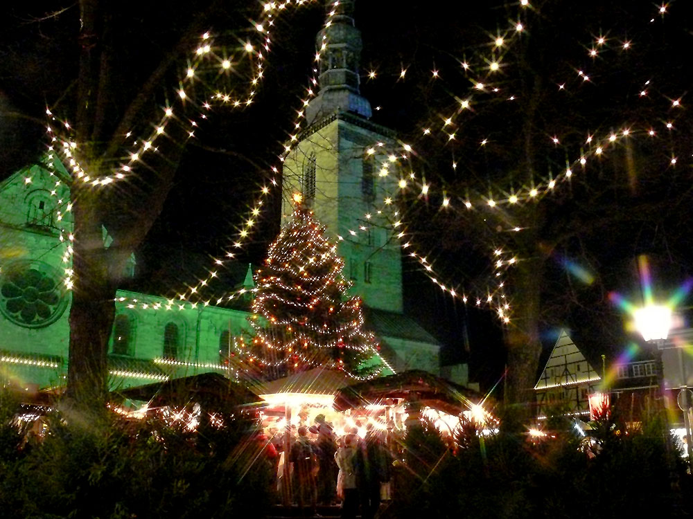 Der nördliche Petrikirchplatz erstrahlt in vielen Lichtern und auch der typische Grünsandstein der Petrikirche wird beleuchtet.